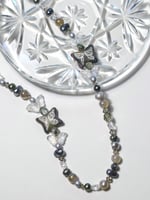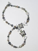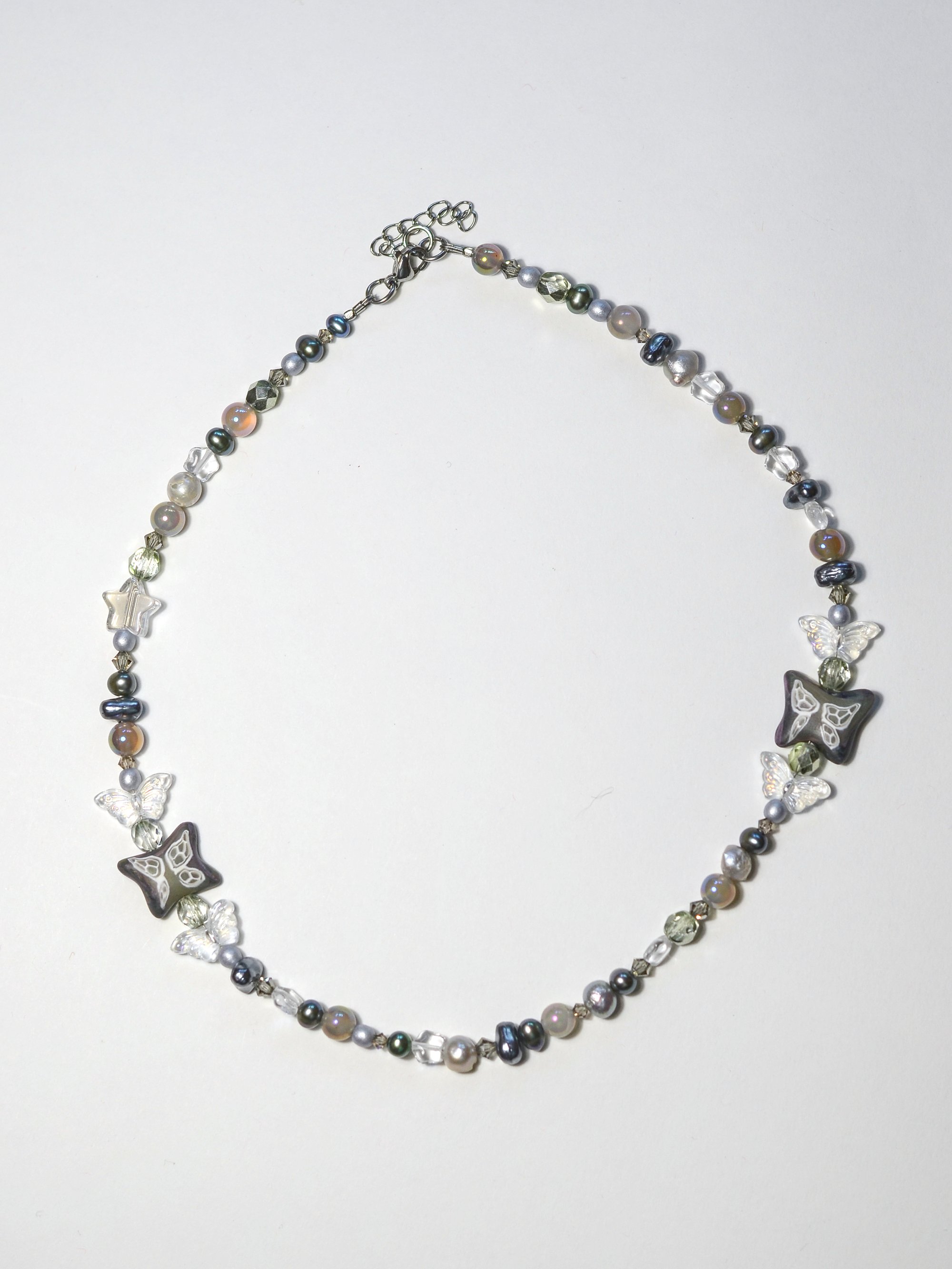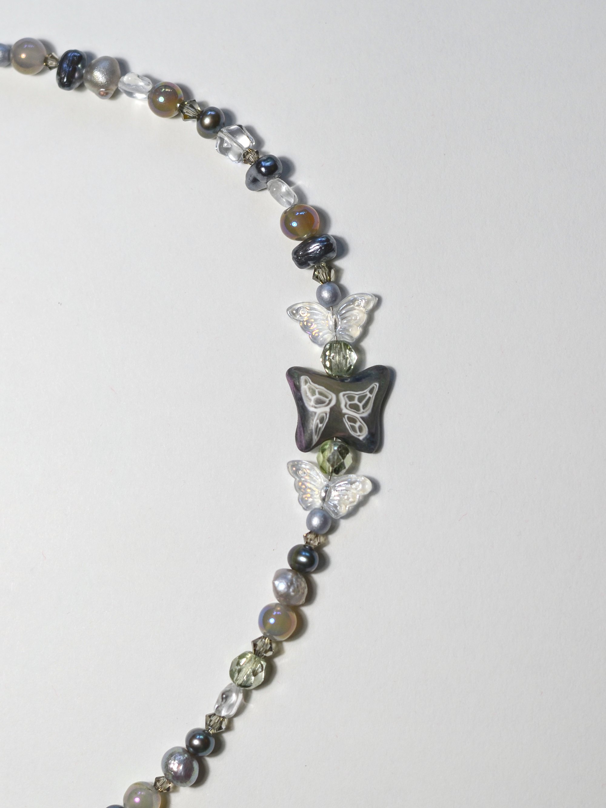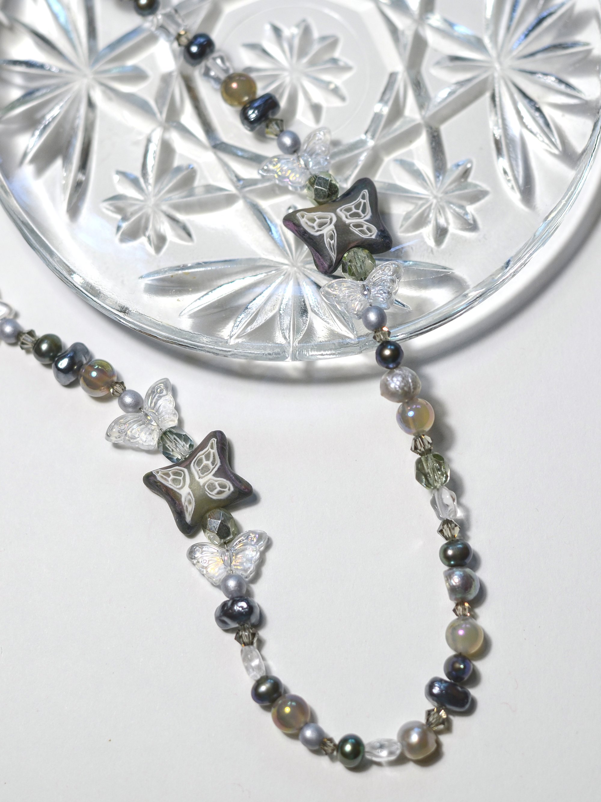 A necklace with two handmade polymer clay butterfly beads, clear glass butterflies, freshwater pearls in shades of silver and green, and a mix of cool-toned glass beads. Completely one-of-a-kind butterflies made by me <3 Stainless steel clasp and extender chain.