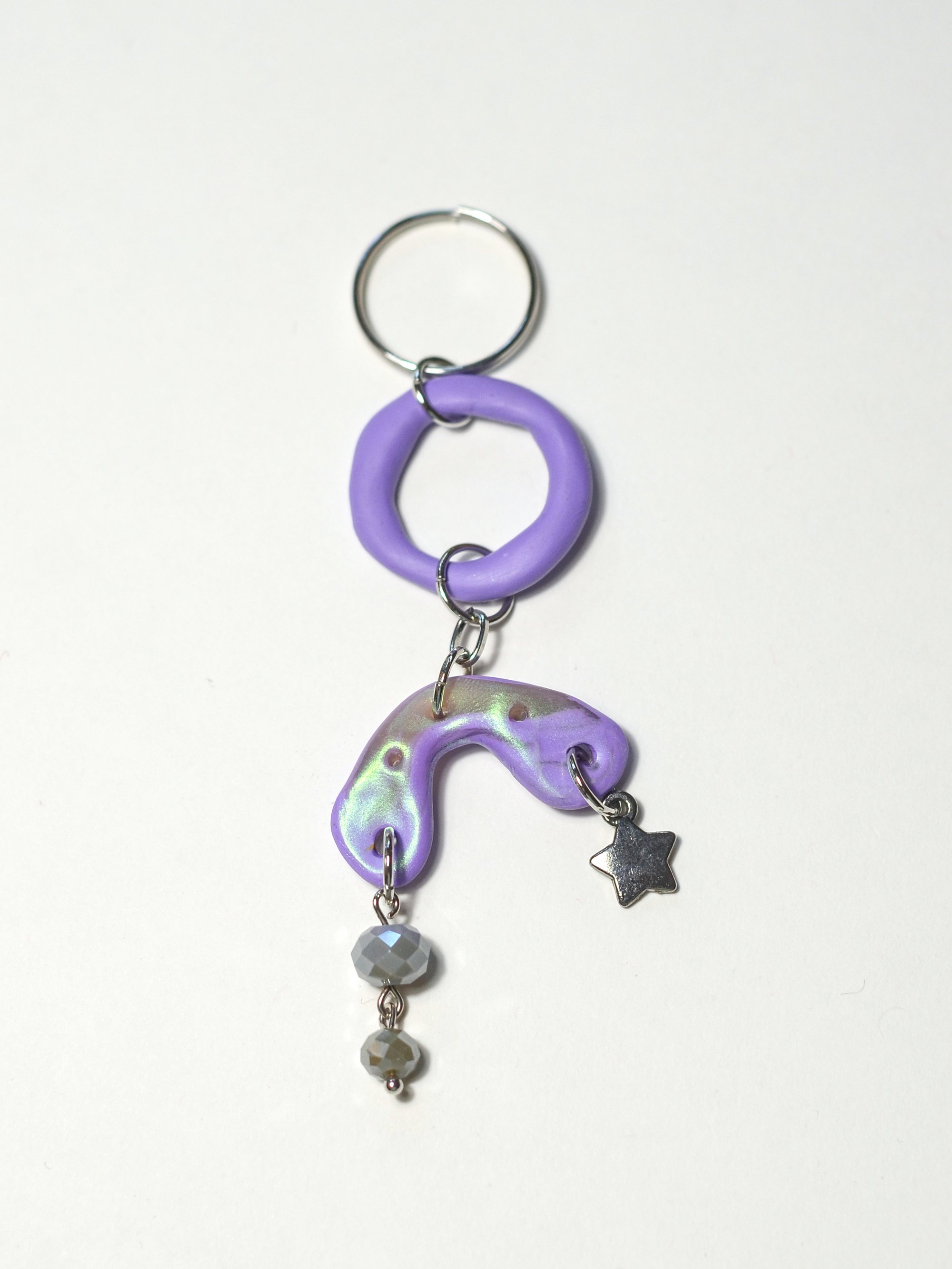 A keychain made from hand-sculpted purple and iridescent polymer clay. A star dangles from one end of the arch, and two grey crystals dangle from the other.
