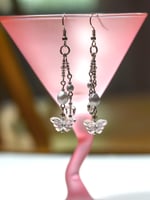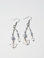 Silver-colored glass beads, sparkling grey crystals, and crystal clear butterflies. Stainless steel ear hooks and hardware.