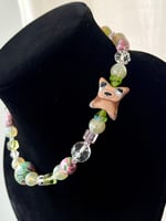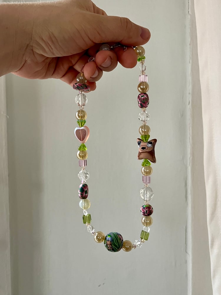 polymer clay beads depicting teddy bears, butterflies, and pink dogwood flowers in a field of colorful glass beads. all clay beads are handmade by me! stainless steel findings.
